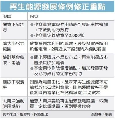 行政院政委吳政忠已完成《再生能源發(fā)展修例》修正草案審查;知情官員透露,草案將增訂契約容量800瓩以上用電大戶,必須設(shè)置再生能源發(fā)電設(shè)備,等於中央法規(guī)將統(tǒng)一訂定用電大戶將強(qiáng)制使用一定比率的再生能源。