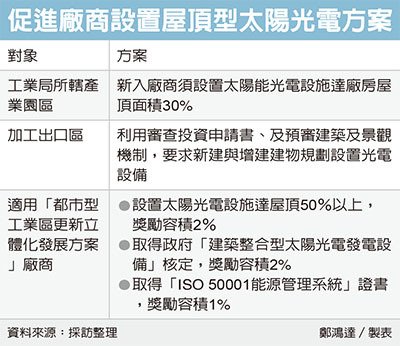 至於經(jīng)濟(jì)部所屬的加工出口區(qū),雖沒(méi)要求最低設(shè)置面積,但仍透過(guò)審查機(jī)制,要求「新建」或「增建」的建物要規(guī)劃設(shè)置光電設(shè)備。