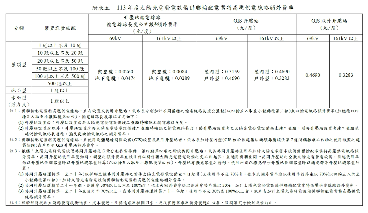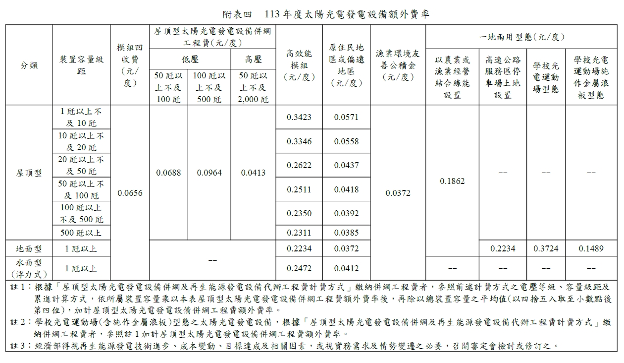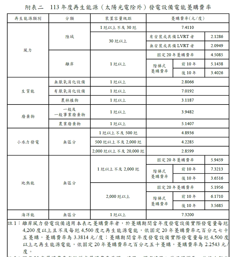 民國113年(西元 2024年)購電費率